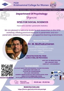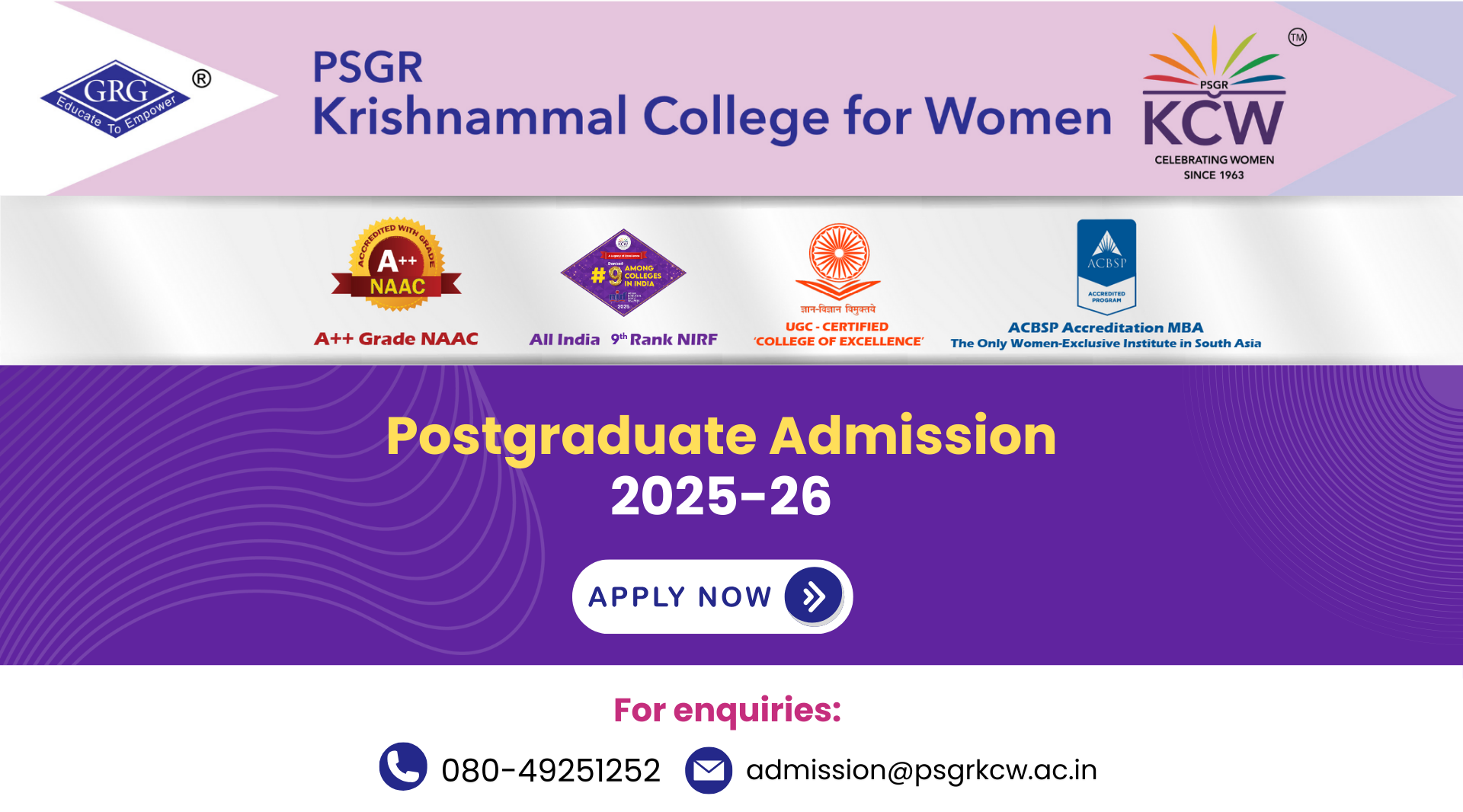 PSGR Krishnammal College for Women (KCW), inaugurated in June 1963 under the aegis of the GRG Trust of Coimbatore has grown over the last six decades into a temple of learning and academic excellence. Founded on a motto of ‘empowering through education’, the ‘women-only’ KCW symbolizes knowledge, love, and service. KCW is an autonomous college of higher education for women. It is affiliated to the Bharathiar University, Coimbatore, ranked #9 among colleges in India in NIRF. Read More...